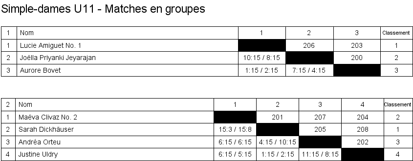 Simple dames U11 Matches en groupe Finale Classement |