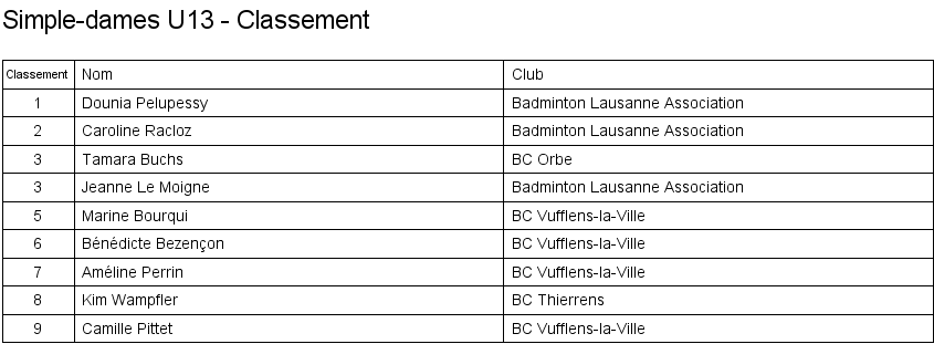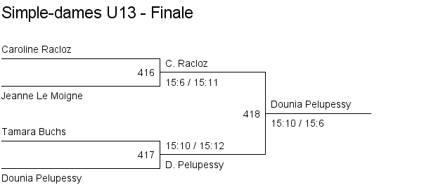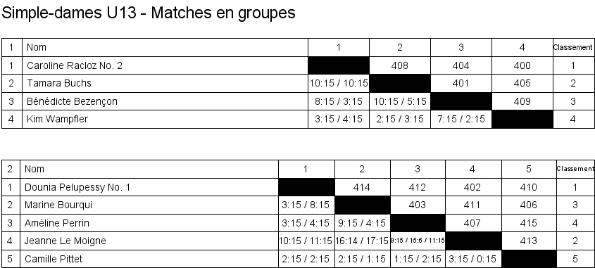 Simple dames U13 Matches en groupe Finale Classement |