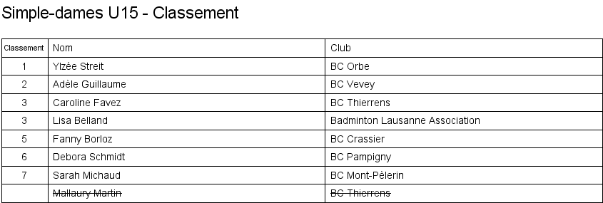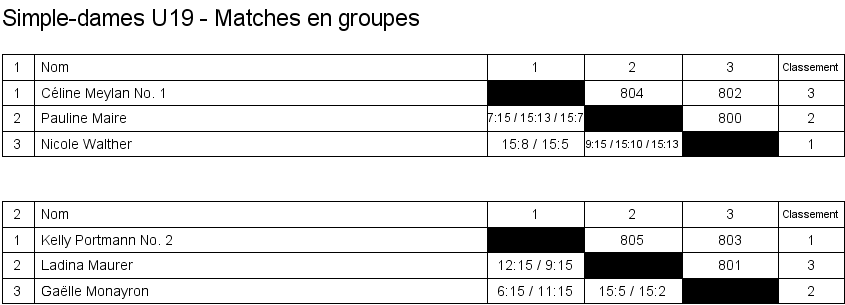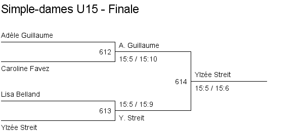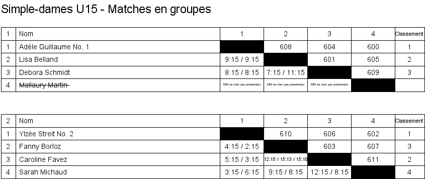Simple dames U15 Matches en groupe Finale Classement |
