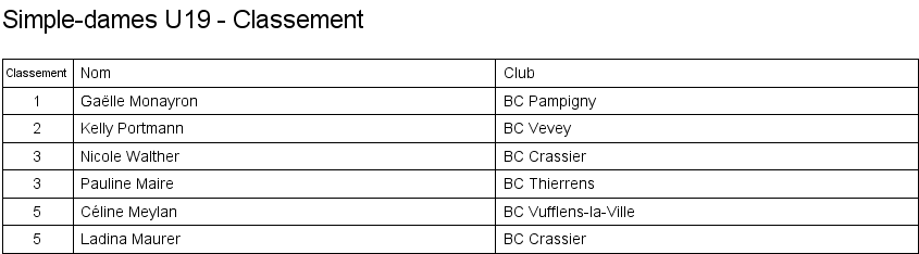 Simple dames U19 Matches en groupe Finale Classement |