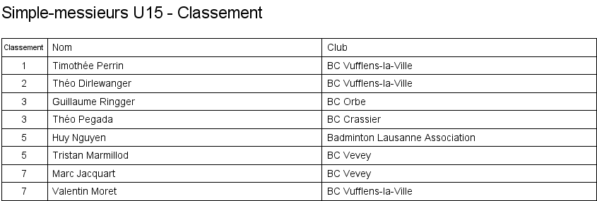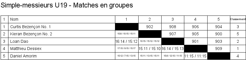 Simple messieurs U15 Matches en groupe Finale Classement |