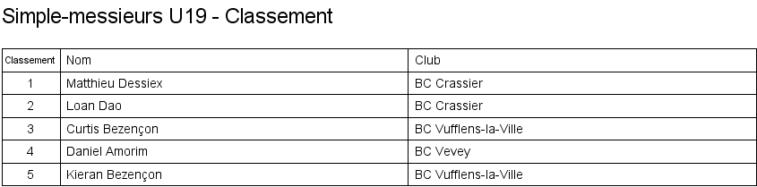 Simple messieurs U19 Matches en groupe Classement |