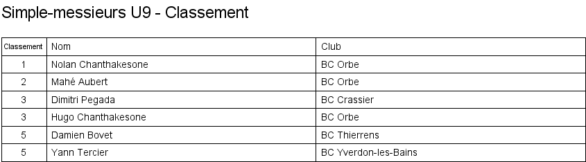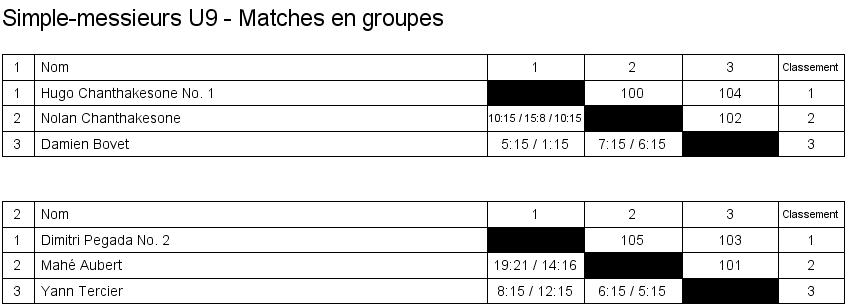 Simple messieurs U9 Matches en groupe Finale Classement |