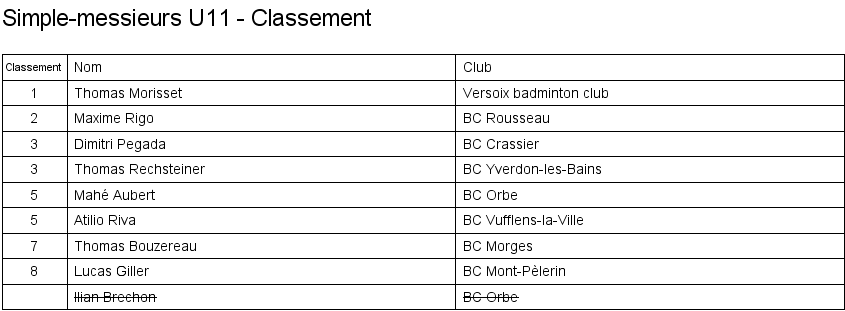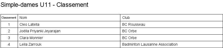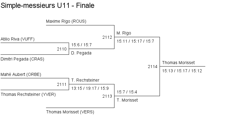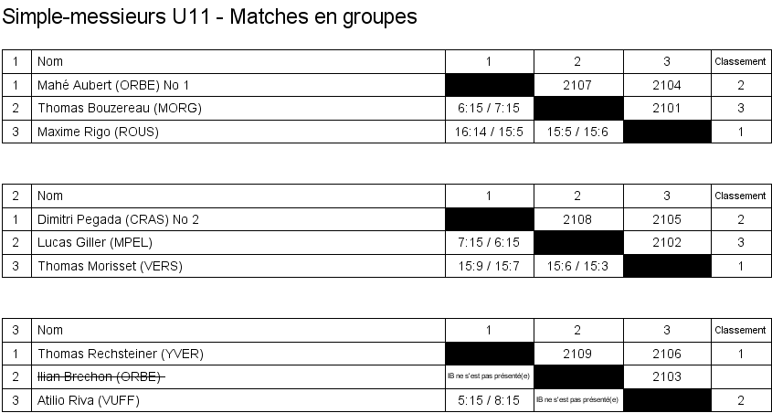 Simple messieurs U11 Matches en groupe Finale Match supplémentaire Classement |