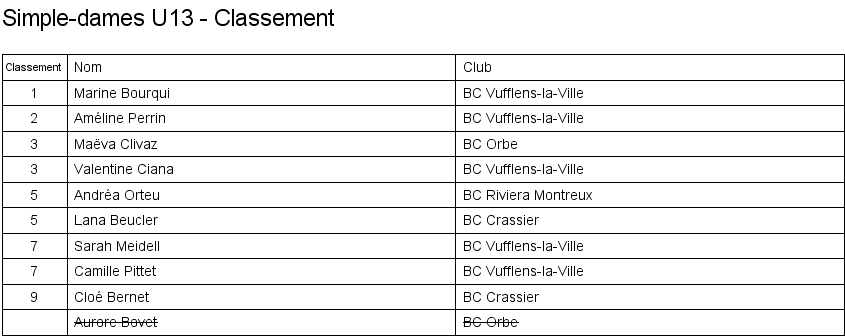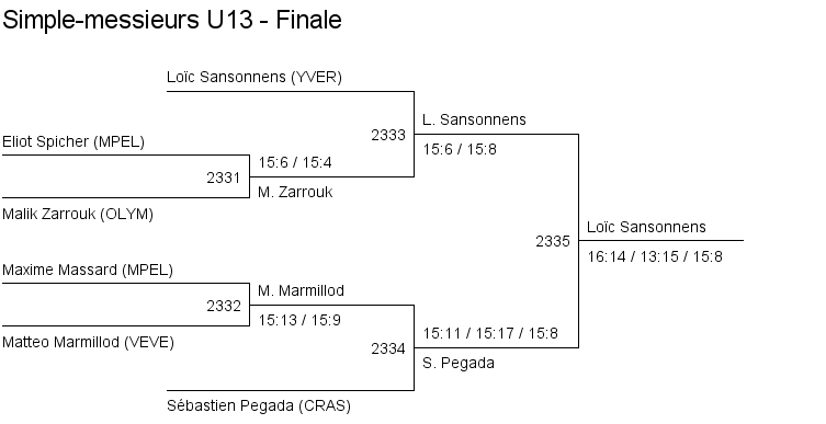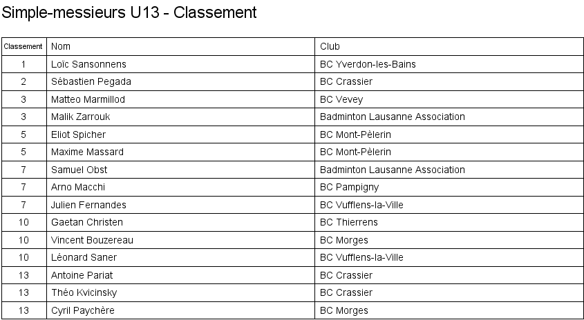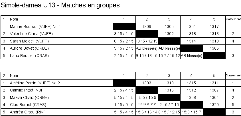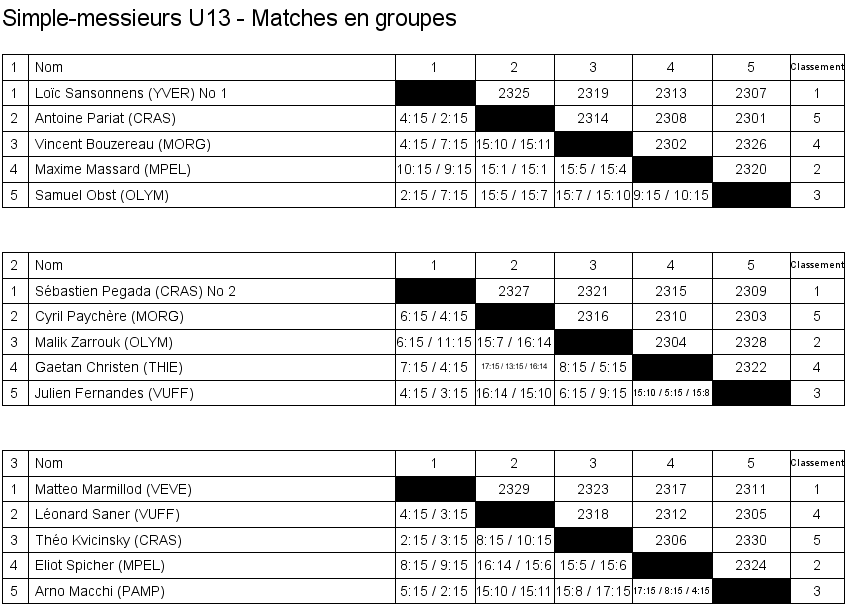 Simple messieurs U13 Matches en groupe Finale Classement |