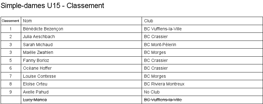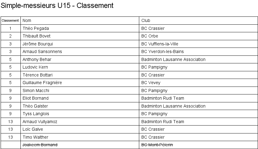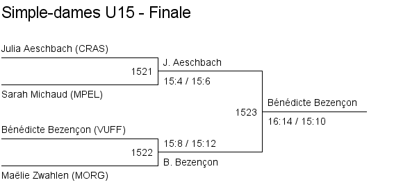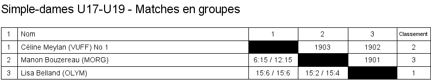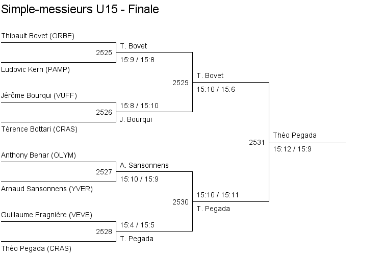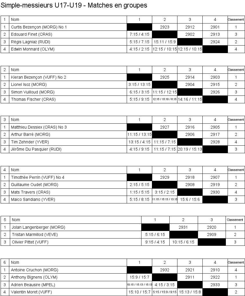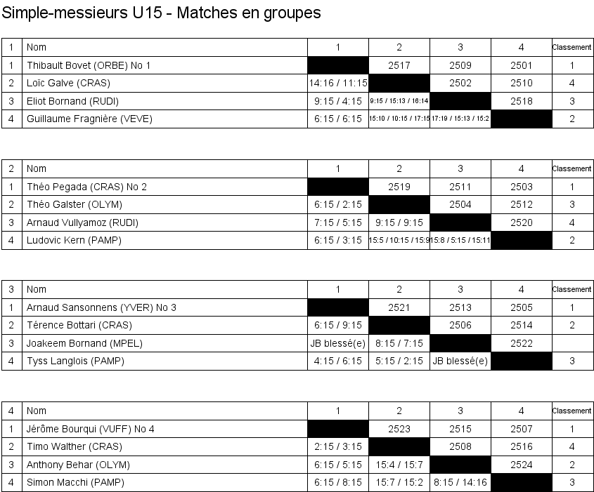 Simple messieurs U15 Matches en groupe Finale Classement |