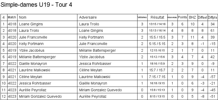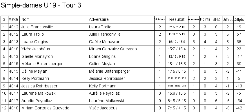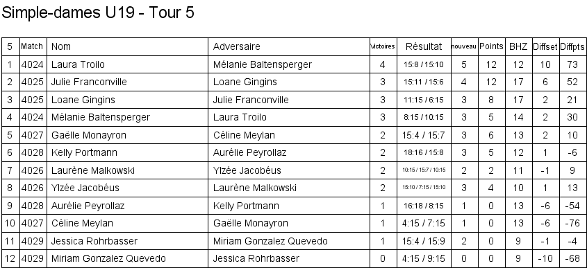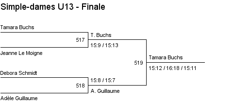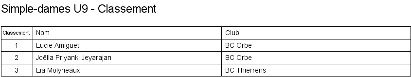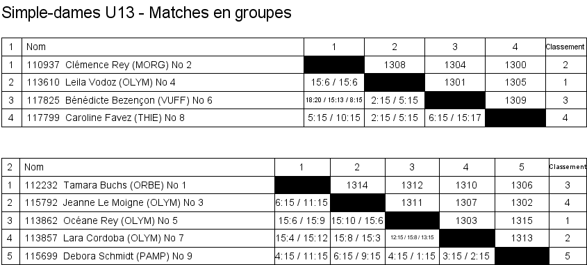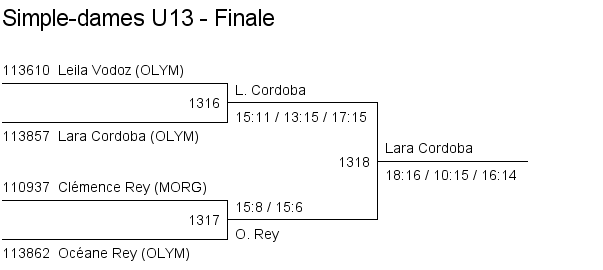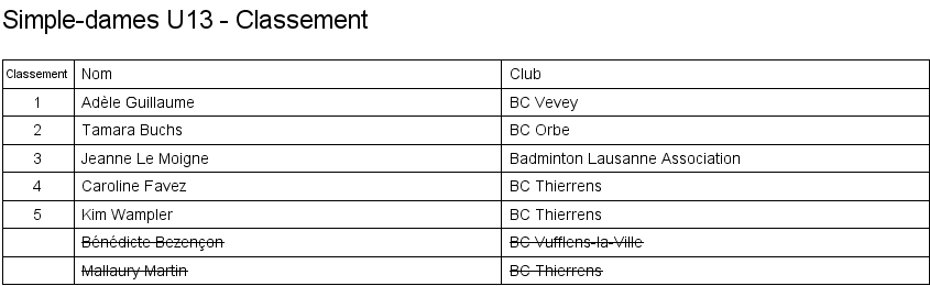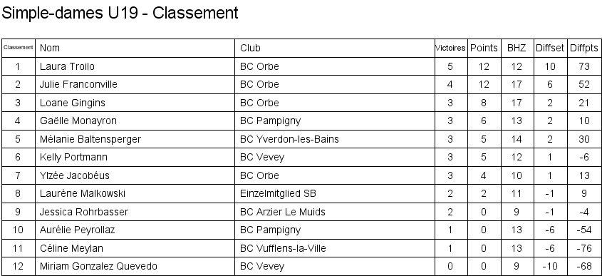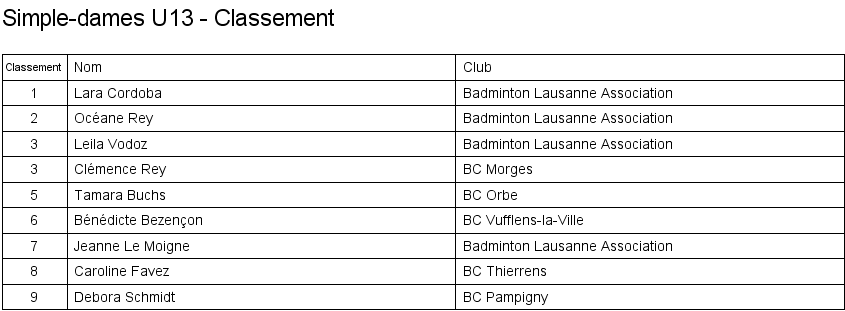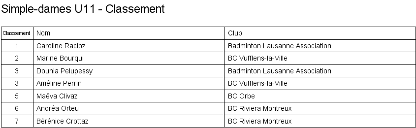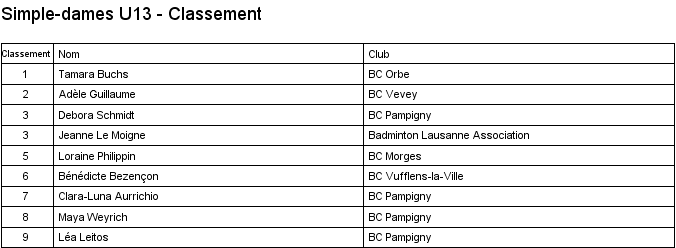 U13 | 1. Lara Cordoba (Lausanne) 2. Océane Rey (Lausanne) 3. Clémence Rey (BC Morges) 3. Leila Vodoz (Lausanne) |