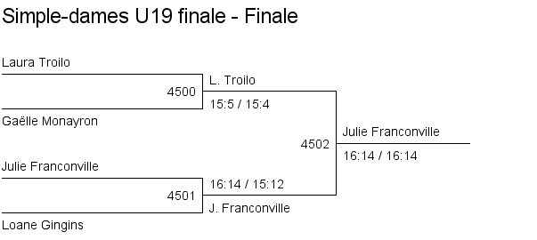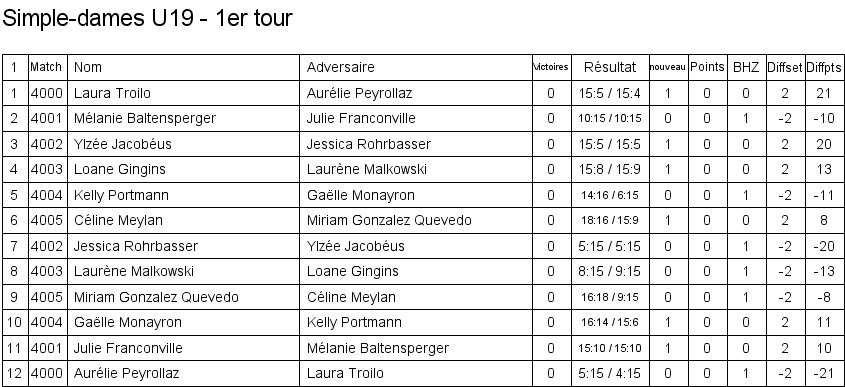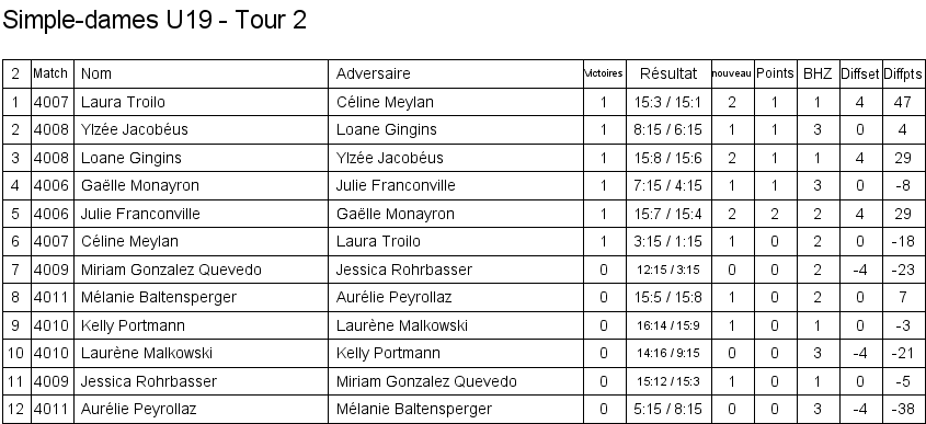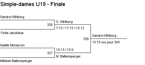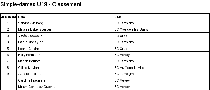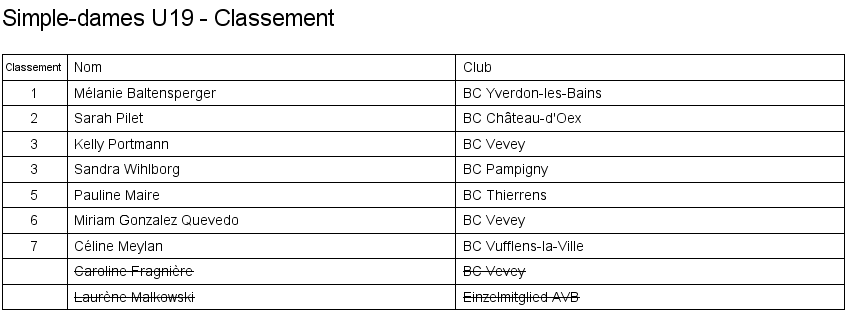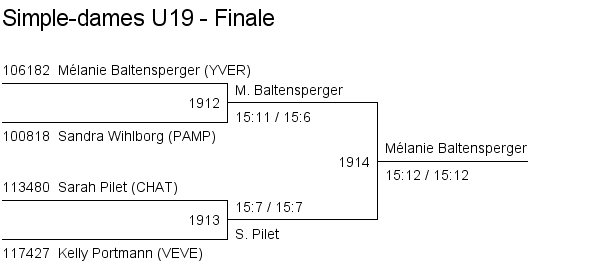 U19 | 1. Mélanie Baltensperger (Yverdon) 2. Sarah Pilet (Crassier) 3. Kelly Portmann (Vevey) 3. Sandra Wihlborg (Pampigny) |