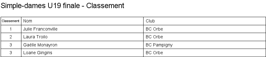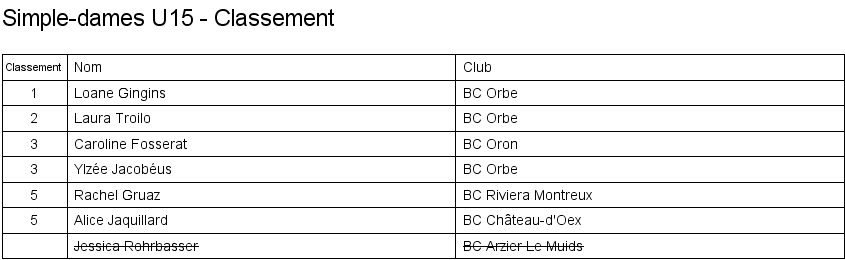 U15 | 1. Loane Gingins (Orbe) 2. Laura Troilo (Orbe) 3. Caroline Fosserat (Oron) 3. Ylzée Jacobéus (Orbe) |