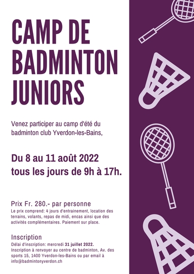 Le BC Yverdon-les-Bains propose une semaine de camp de badminton pour les juniors, du 8 au 11 août 2002.